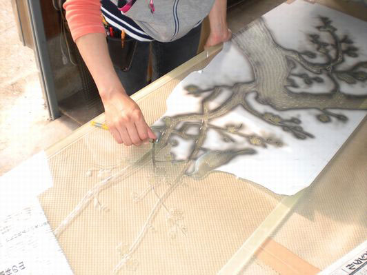 - 制作:入金が確認されますと、デザインを原寸大に拡大し、それをシートに複写し、ガラス彫刻作業に入ります。